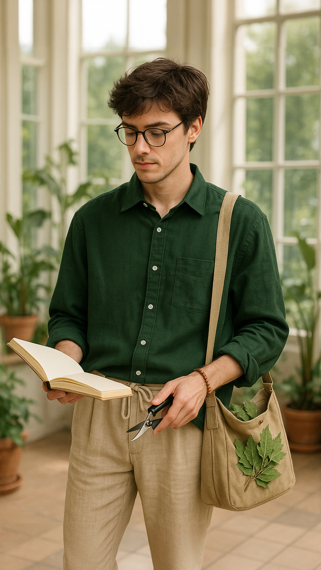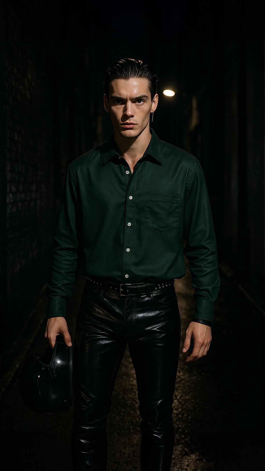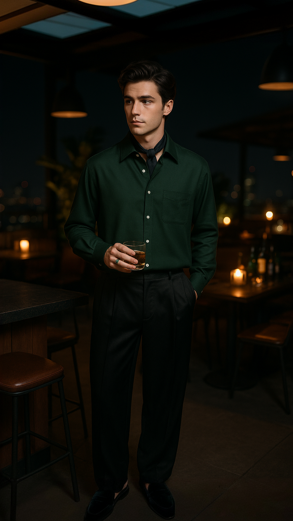 Ideal with cream pants, dark sandals or loafers, hair swept back, perhaps a linen stole for texture. Add a fragrance with vetiver or oud, and let the green pull people in without ever calling out. Because every man needs a green that grounds him. Because not every jewel shines — some shimmer in shadows. Because Cypress Dusk is not for standing out, but for standing within.