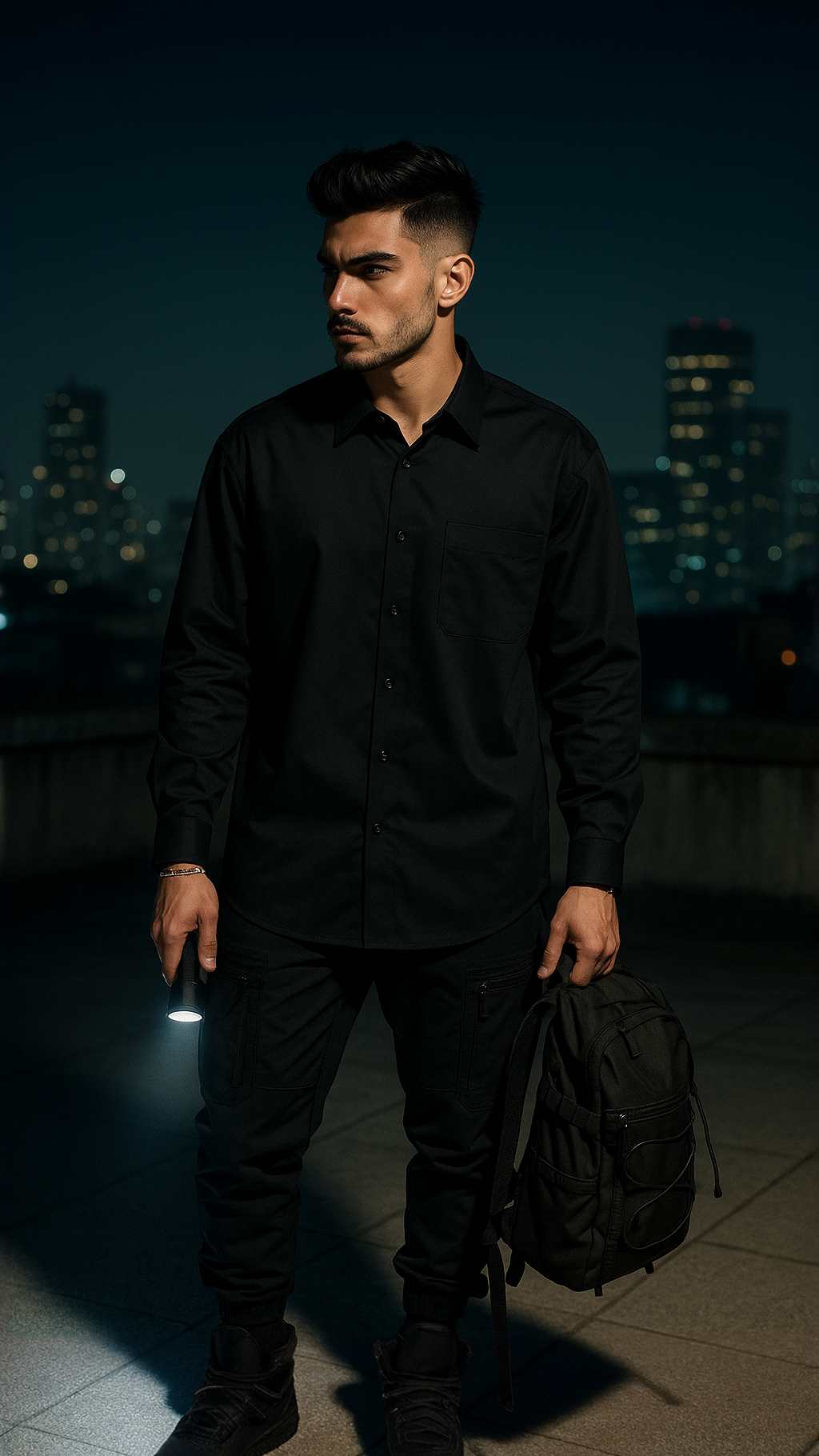 This piece is a wearable nightfall. All black look with a linen pant, or break it with beige. A cuffed sleeve, heavy silver bracelet, and classic chappals complete the aura. Because black isn't just a colour — it's a canvas. Inkroot is for men who carry silence like a sword and style like poetry.