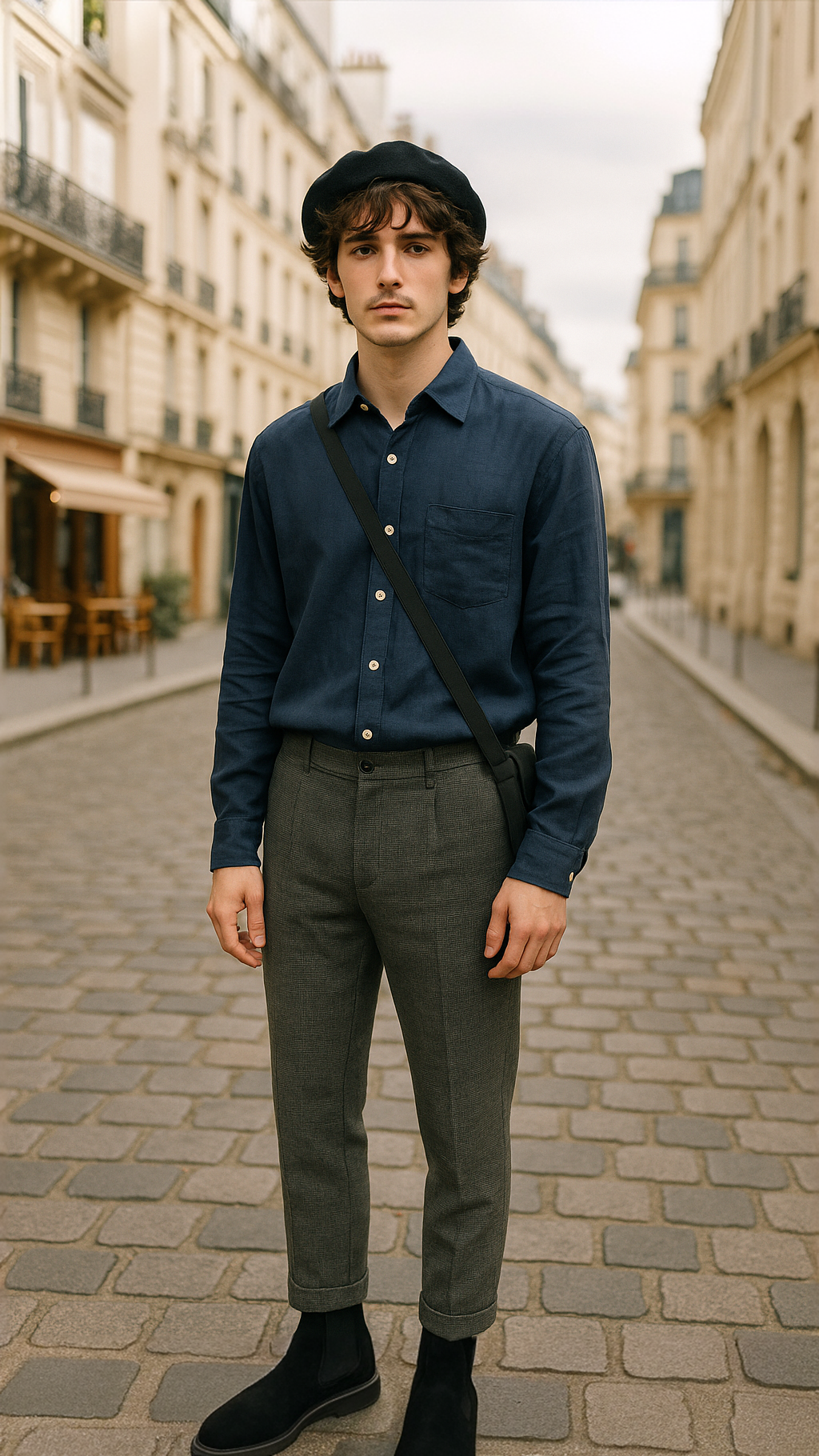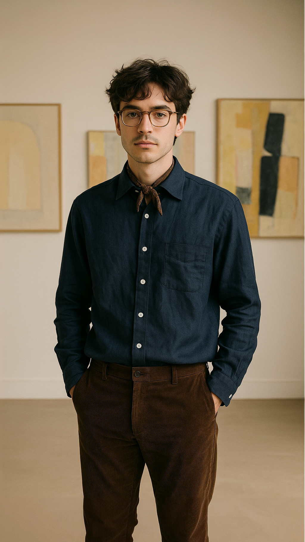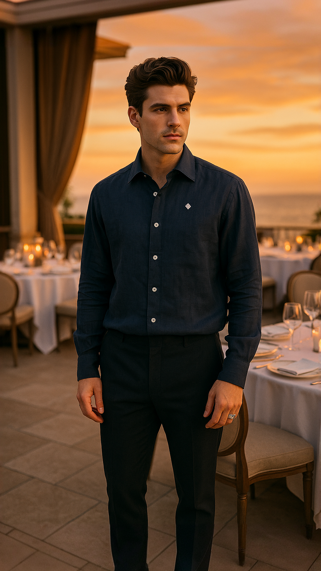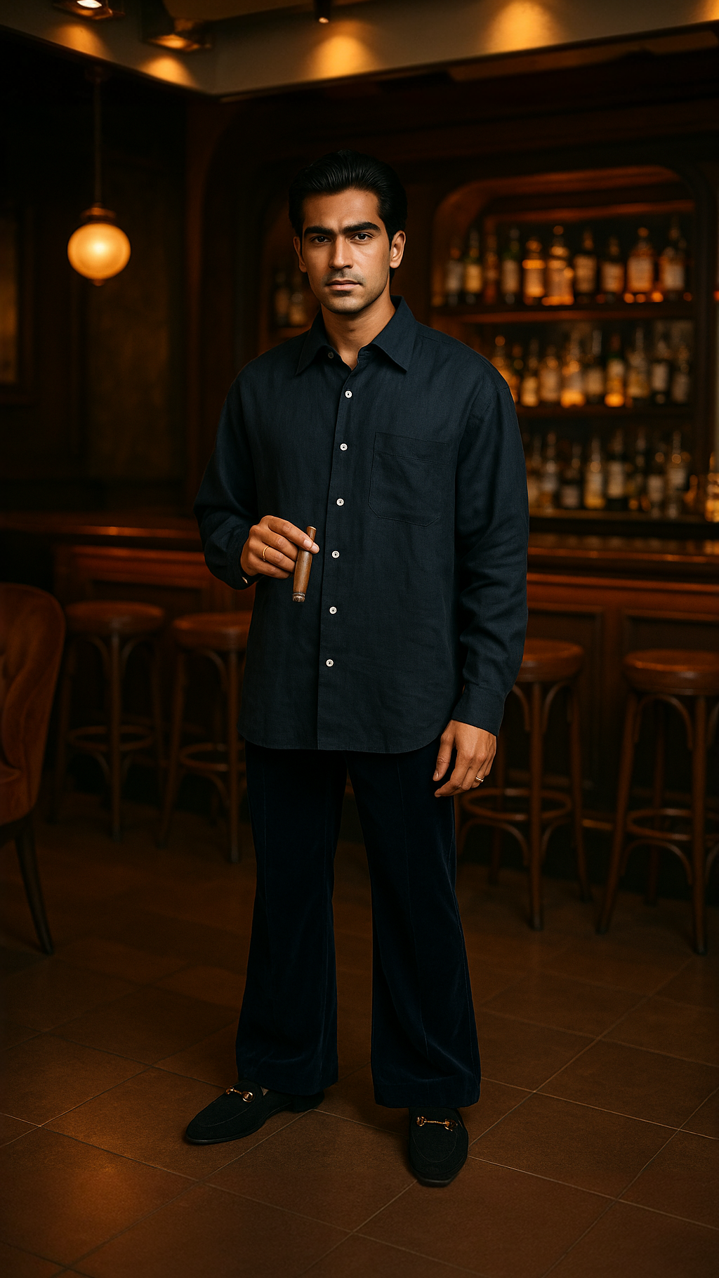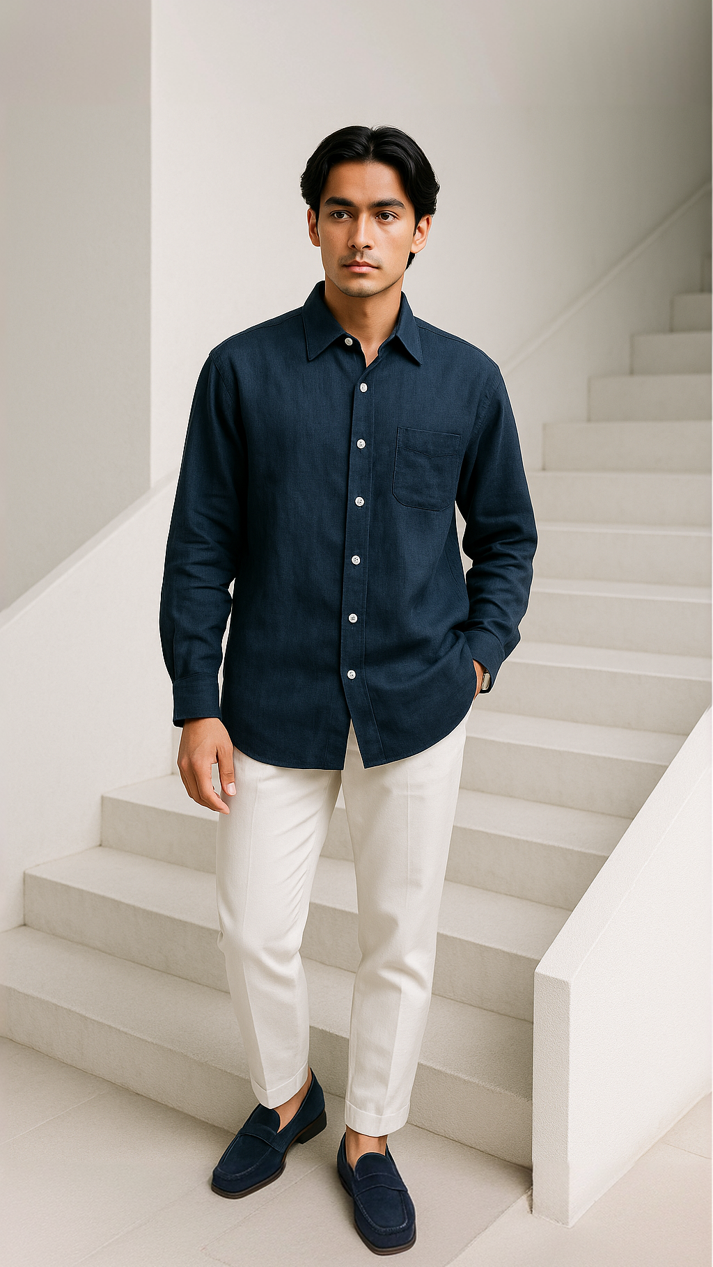 Just endlessly useful. This is a shirt for the man who doesn’t chase attention — it finds him anyway. Linen evokes old Calcutta evenings, jazz clubs, monsoon cities. Navy — the colour of wisdom and mood in Indian textiles. Tuck into beige trousers, wear loose over shorts, roll the sleeves. Gold watch, sandals or worn-in sneakers.